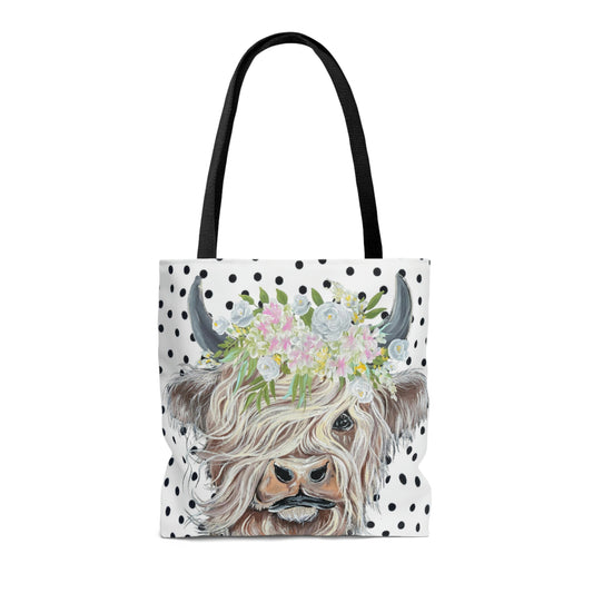 Copy of Highland Cow Tote Bag Black and white polka dot background reusable shopping gym nursury bag