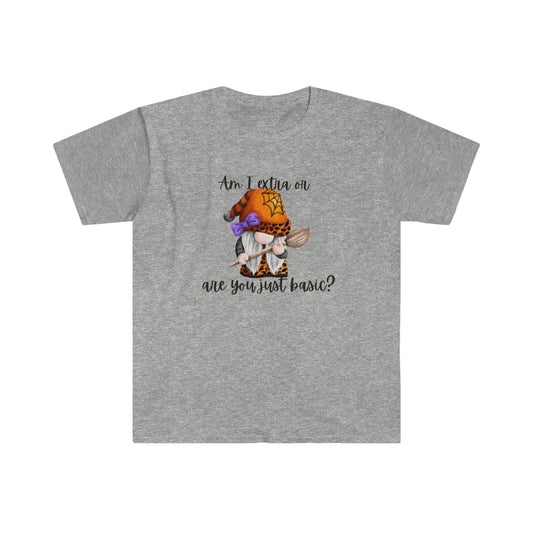 Halloween Gnome, Orange, purple, Am I extra or are you just basic? Snarky humor, Unisex Softstyle T-Shirt