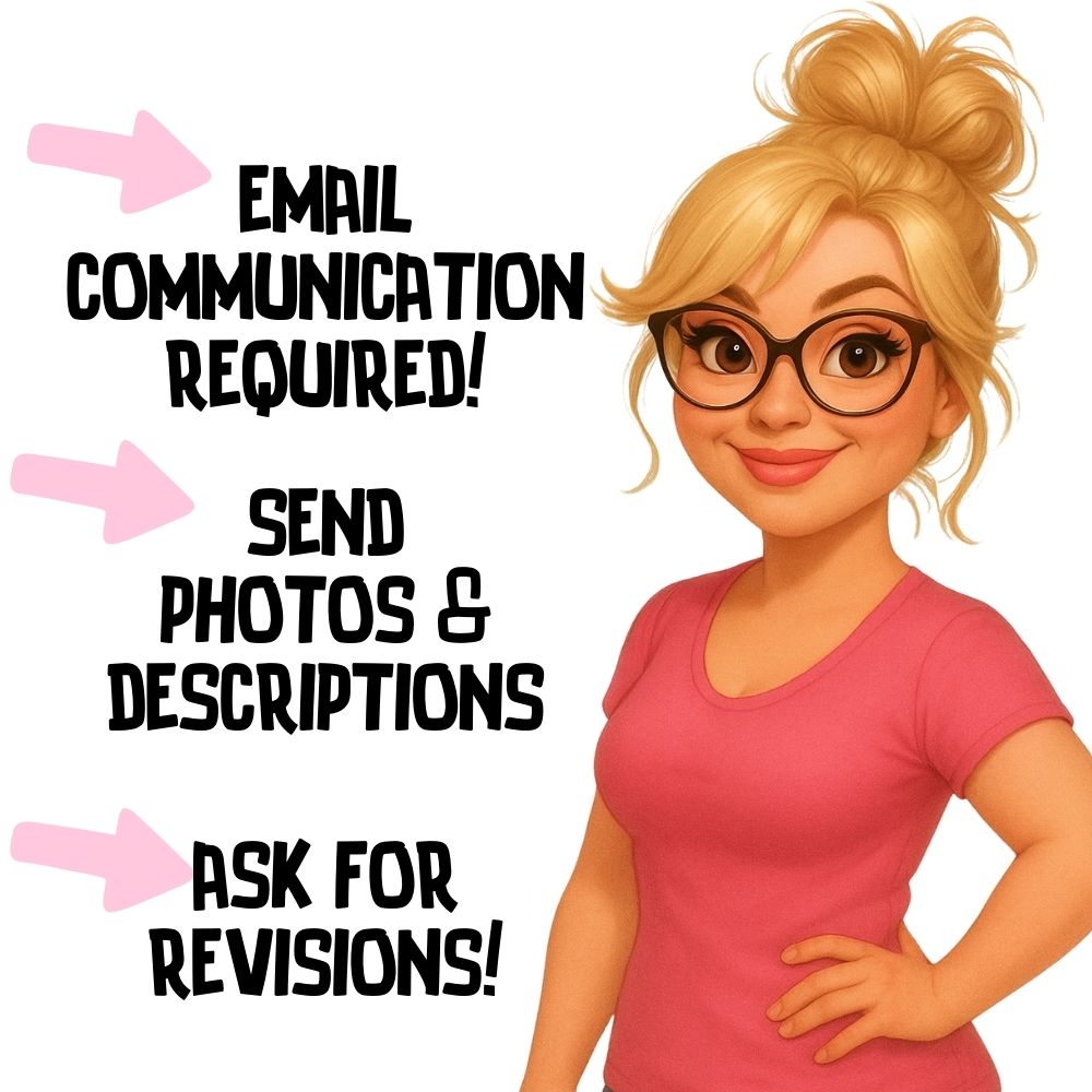 One Character Only per listing, contact Kimberly to discuss additional poses, people, animals or large items for an extra charge.