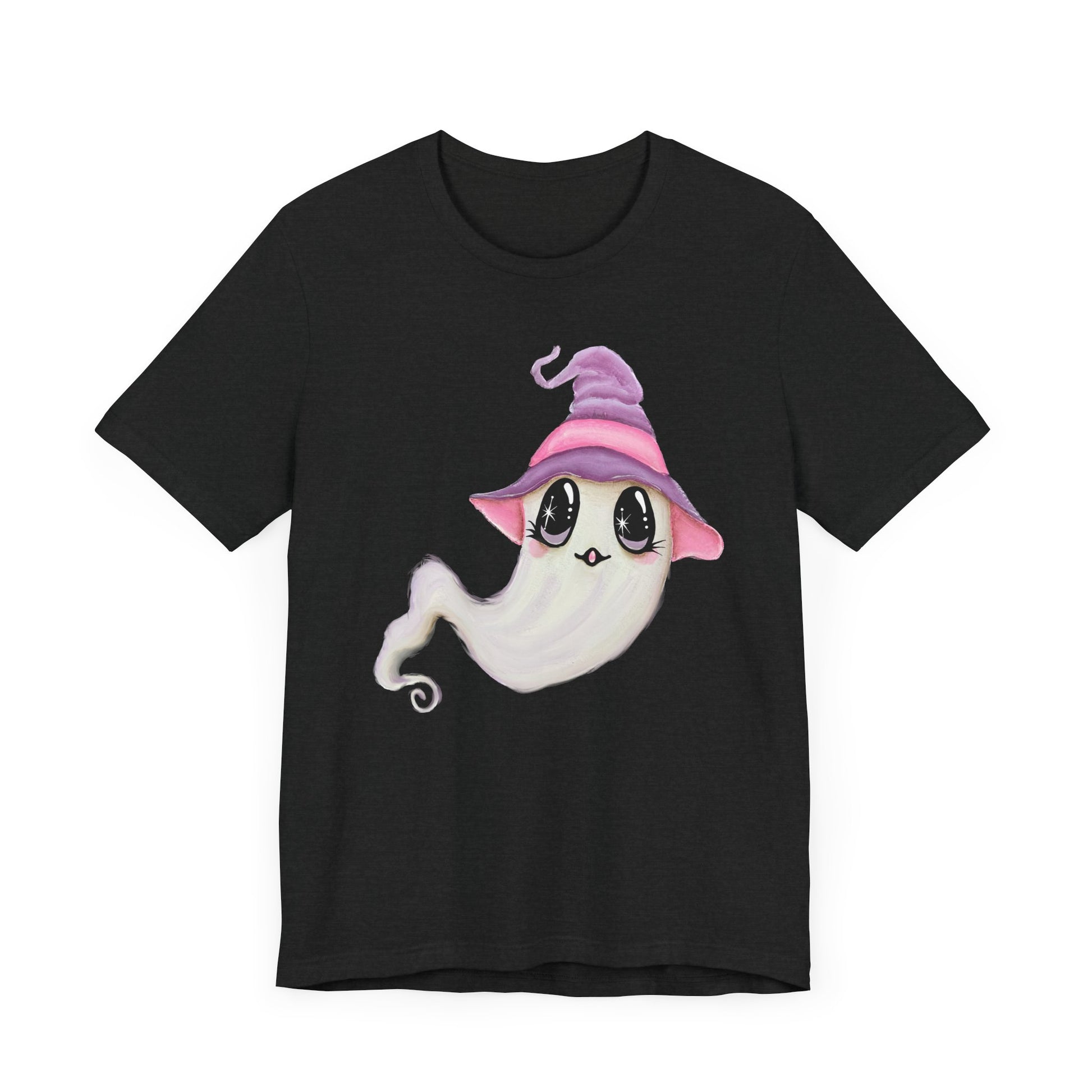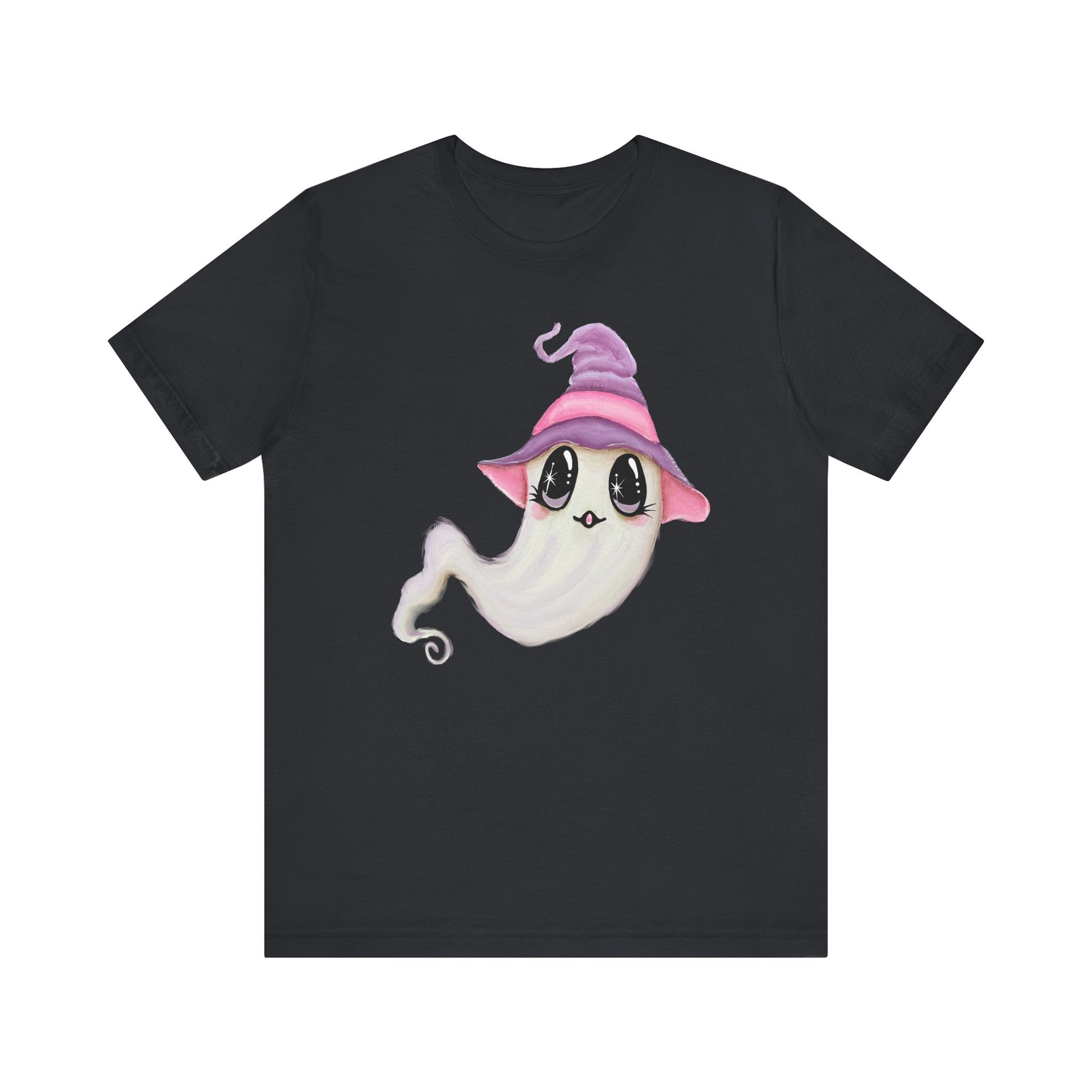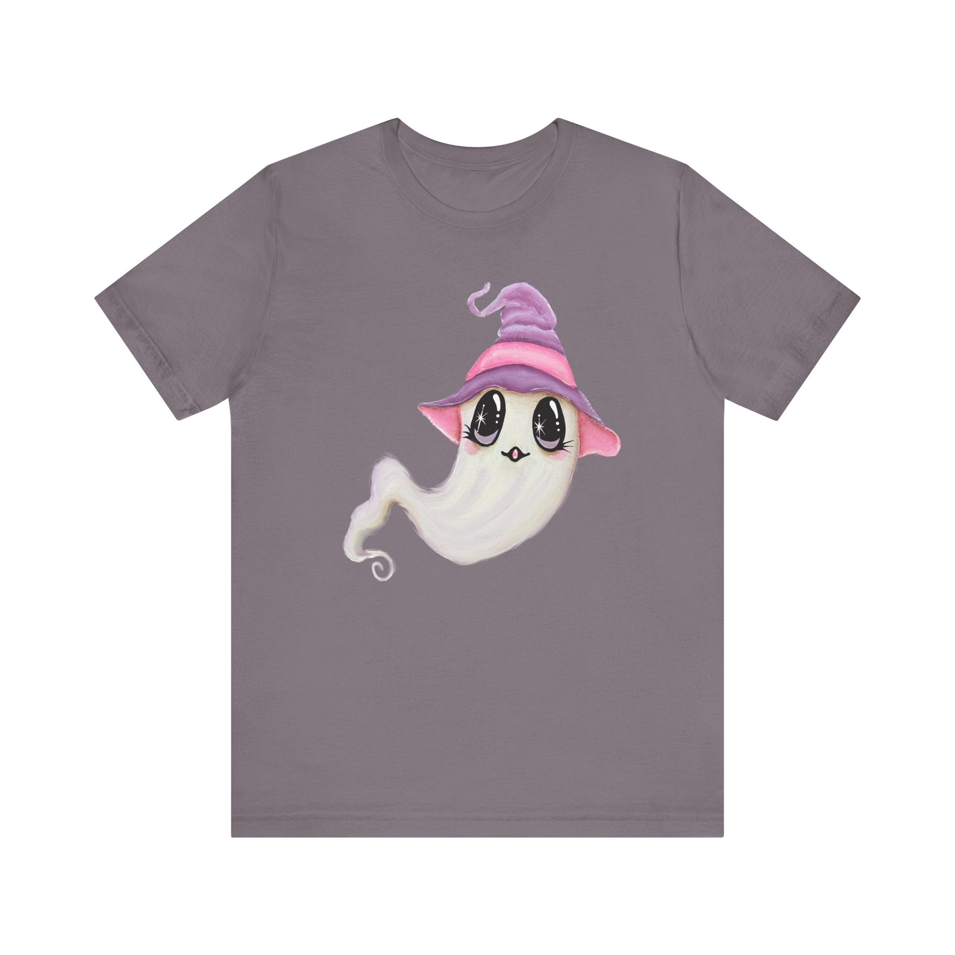 This T-Shirt features a Halloween Ghost in a purple witch hat, a cute ghost cartoon illustration from original hand painted artwork created by Kimberly Sminkey. It has a fun but not too spooky vibe, perfect for Halloween celebrations for all ages!