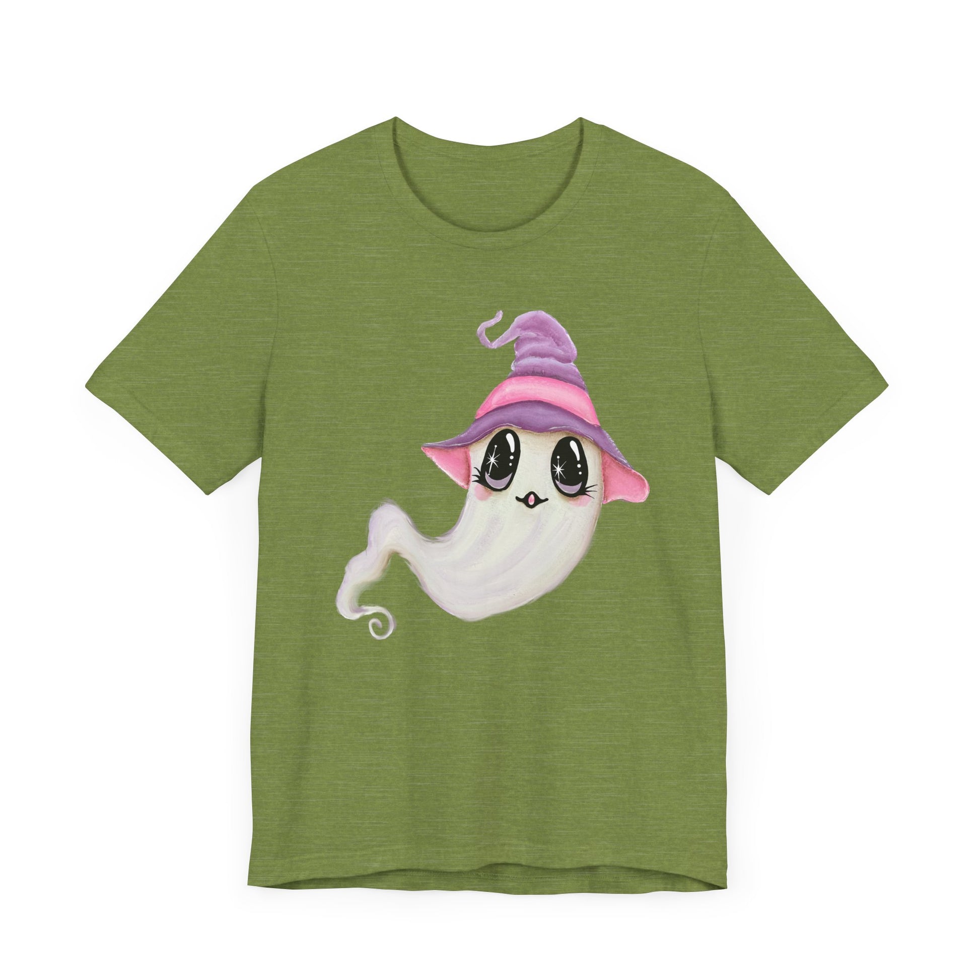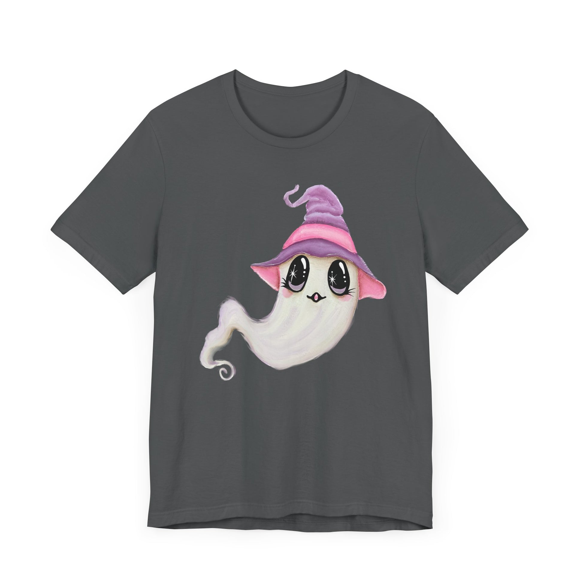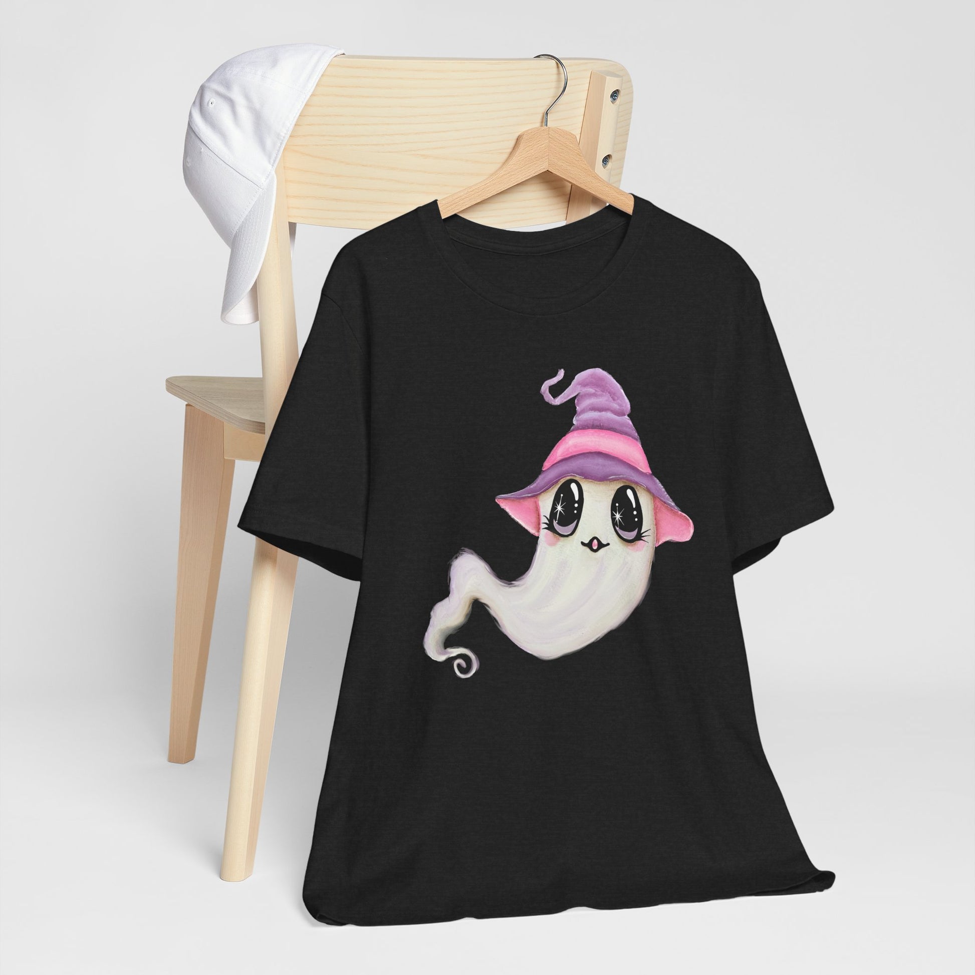 This T-Shirt features a Halloween Ghost in a purple witch hat, a cute ghost cartoon illustration from original hand painted artwork created by Kimberly Sminkey. It has a fun but not too spooky vibe, perfect for Halloween celebrations for all ages!