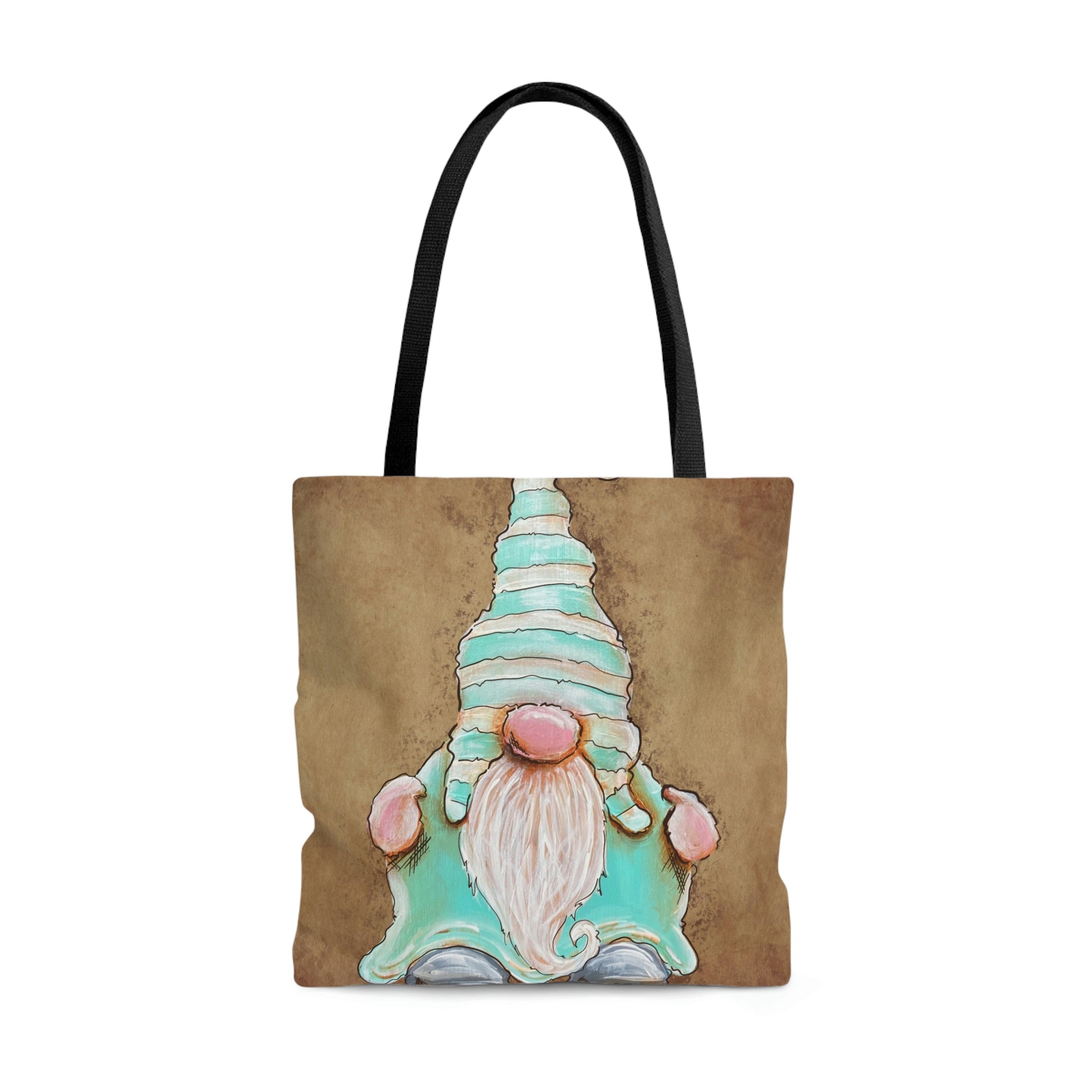On the front and back is our original hand painted gnome artwork in teal and rustic browns. The colors are vibrant and rich with intricate details that really bring the design to life and will catch the eye!