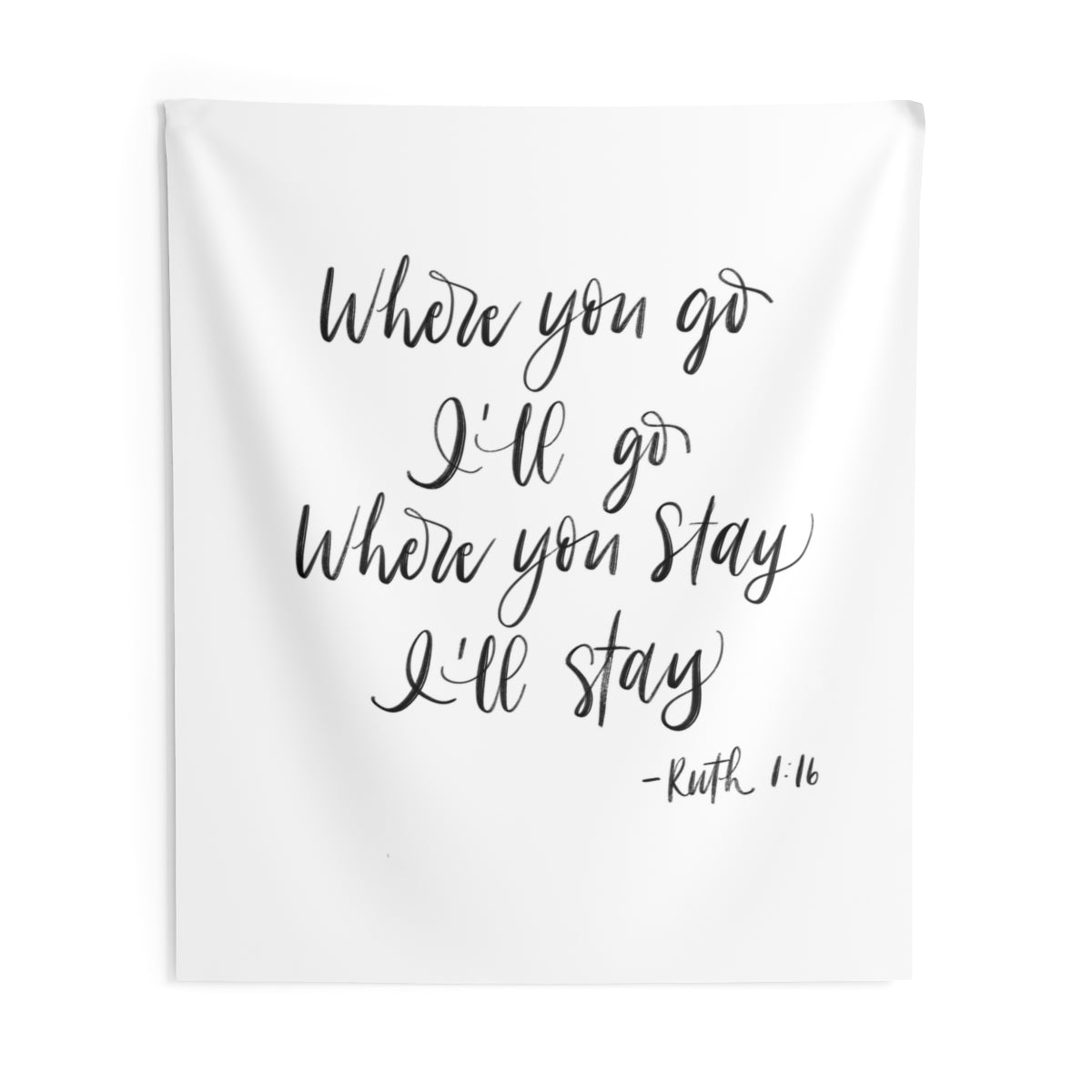 Ruth 1:16 "Where you go I'll go, where you stay I'll stay" Hand lettered in Kimberly's signature modern callligraphy style, then printed directly onto the tapestry.